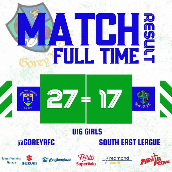 The U16 girls of Gorey RFC made the trip to Wicklow for a tough evening clash, battling through brutal weather conditions in what turned out to be a hard-fought contest. Despite their best efforts, the girls fell short with a final score of 27-17.