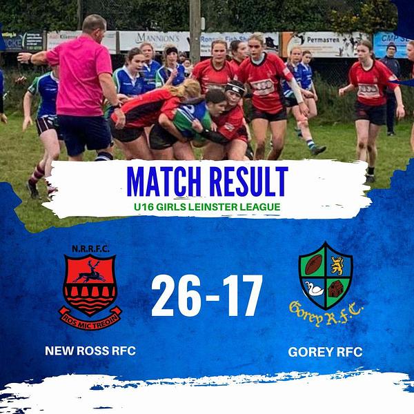 Sunday 16th November: U16 Girls – Leinster League – New Ross v Gorey Venue: New Ross RFC Final Score New Ross 26 Gorey 17