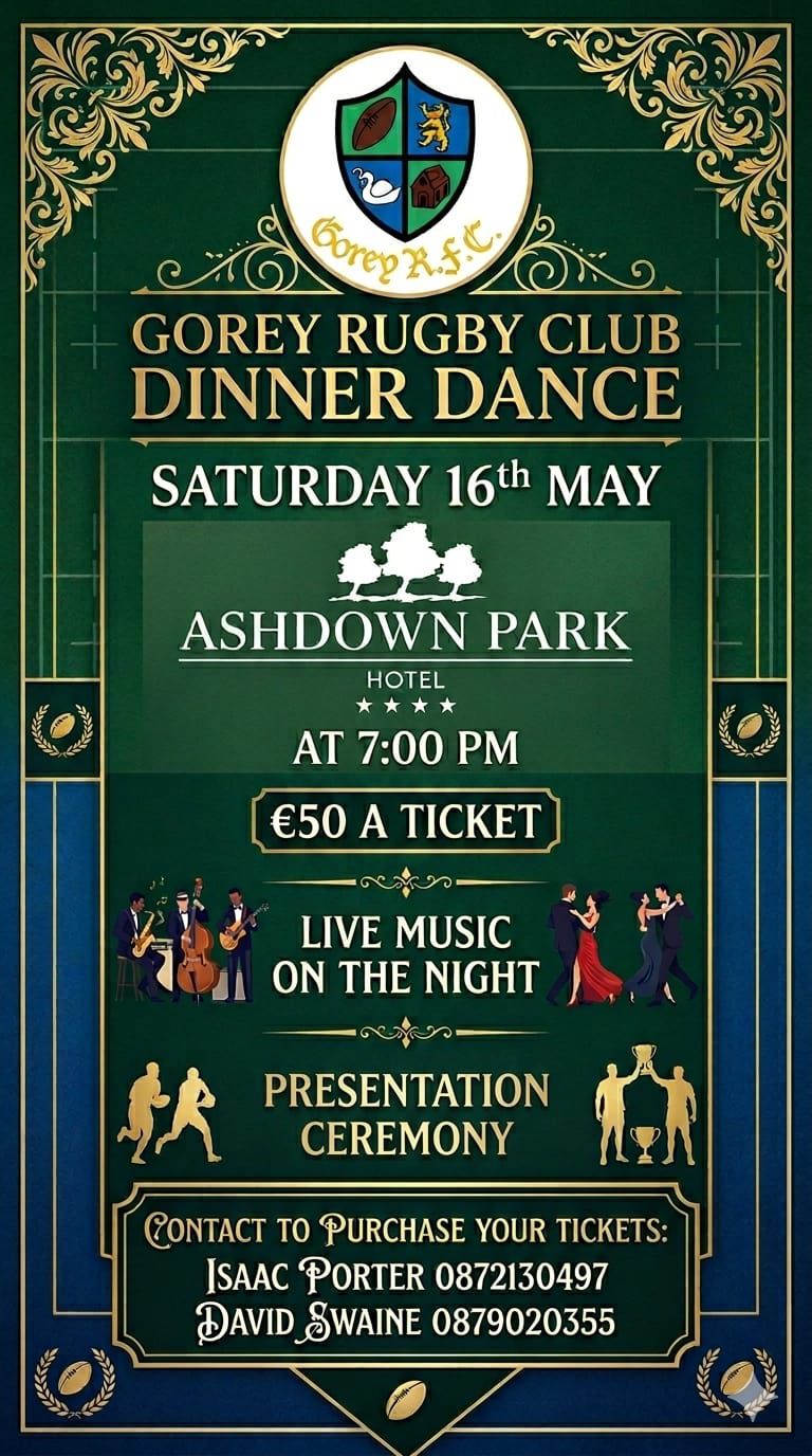 Gorey RFC invites you to the evening to celebrate the successes of Gorey RFC's 2025/2026 season.